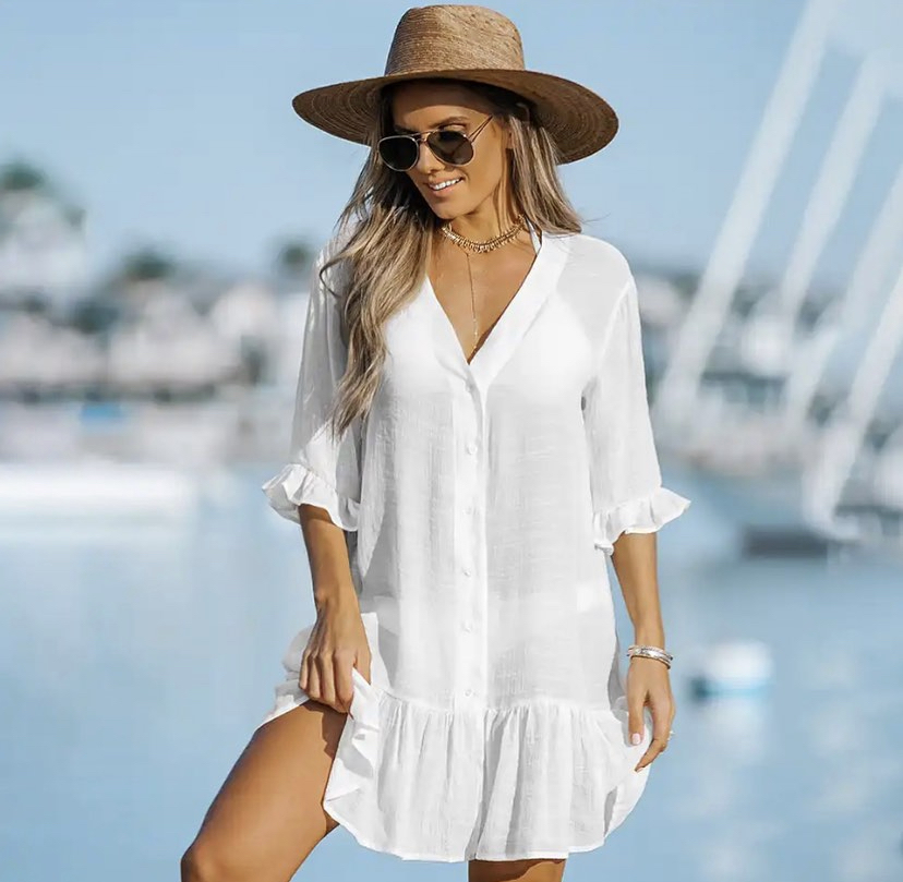 Tecido linho de algodão , leve e fluida . Ideal para sair do mar, piscina e também usar em momentos mais casuais